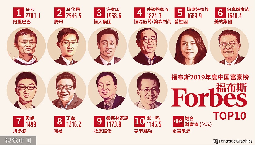 今年,刚卸任阿里巴巴董事局主席的马云以2,701.1亿元财富蝉联榜首。腾讯CEO马化腾排名第2位,身家为2,545.5亿元;恒大集团董事局主席许家印排名仍为第3位,身家为1,958.6亿元。马化腾和许家印的排名与去年一致。