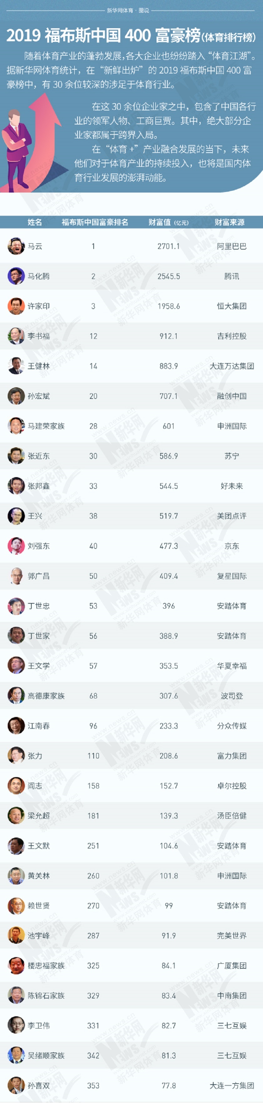武汉卓尔俱乐部老板阎志的财富为152.7亿元,位列第158位,目前俱乐部积38分,在中超位列第6位。此外,大连一方的孙喜双也进入榜单,孙喜双的财富为77.8亿元,位列第353位。