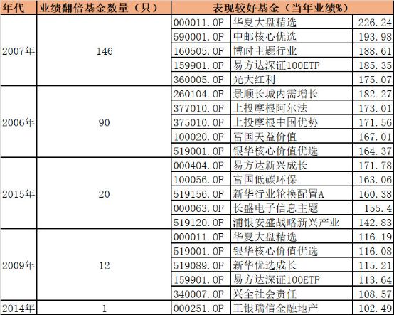 扎堆业绩翻倍的情况出现在2007年。WIND资讯数据显示,当年有146只基金收益超过100%,最好一只基金华夏大盘收益高达226.24%,也是当年唯一收益率超过200%的基金,也打响王亚伟明星基金经理的名头。