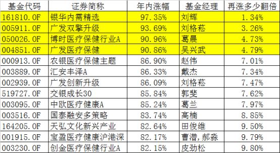 以广发医疗保健为例,今年以来收益率是90.86%,看着距离100%还差近10个百分点,但由于已经暴涨90%以上,只需要再上涨4.79%,就能达到100%了。