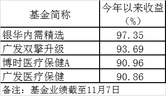 基金君发现,截至11月7日,今年以来一批基金收益率超过60%,业绩超过90%的基金已经达到四只(不计算分级基金)。银华内需精选、广发双擎升级、博时医疗保健行业A、广发医疗保健今年以来收益已经达到97.35%、93.69%、90.96%、90.85%。