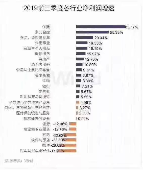 根据wind公开数据显示,2019年前三季度各行业净利润增速排名中,金融行业稳居前三,保险业以83.17%的增速位居首位,媒体业则以-28.62%的负增长排名倒数第二。反观近两年身边不断转型、跳槽的媒体人,确实验证了这样的结果。