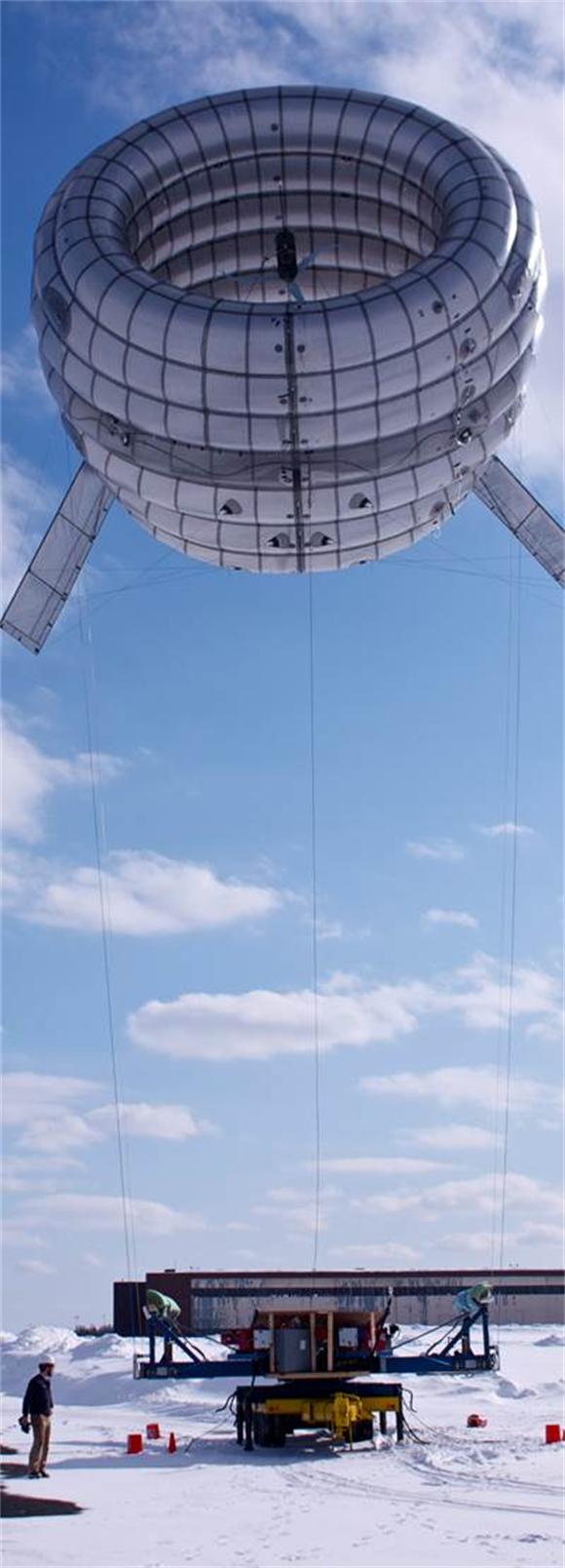 这台由风机、气球及绳索组成的空中发电机,它的叶片和发电机被放置在充入氮气的气球上,悬浮于空中的气球则由三组结实的绳索加以固定,使其不至于飞得太远,而风机在高空捕获的风能也将由这些绳索中内置的线路传输回地面。