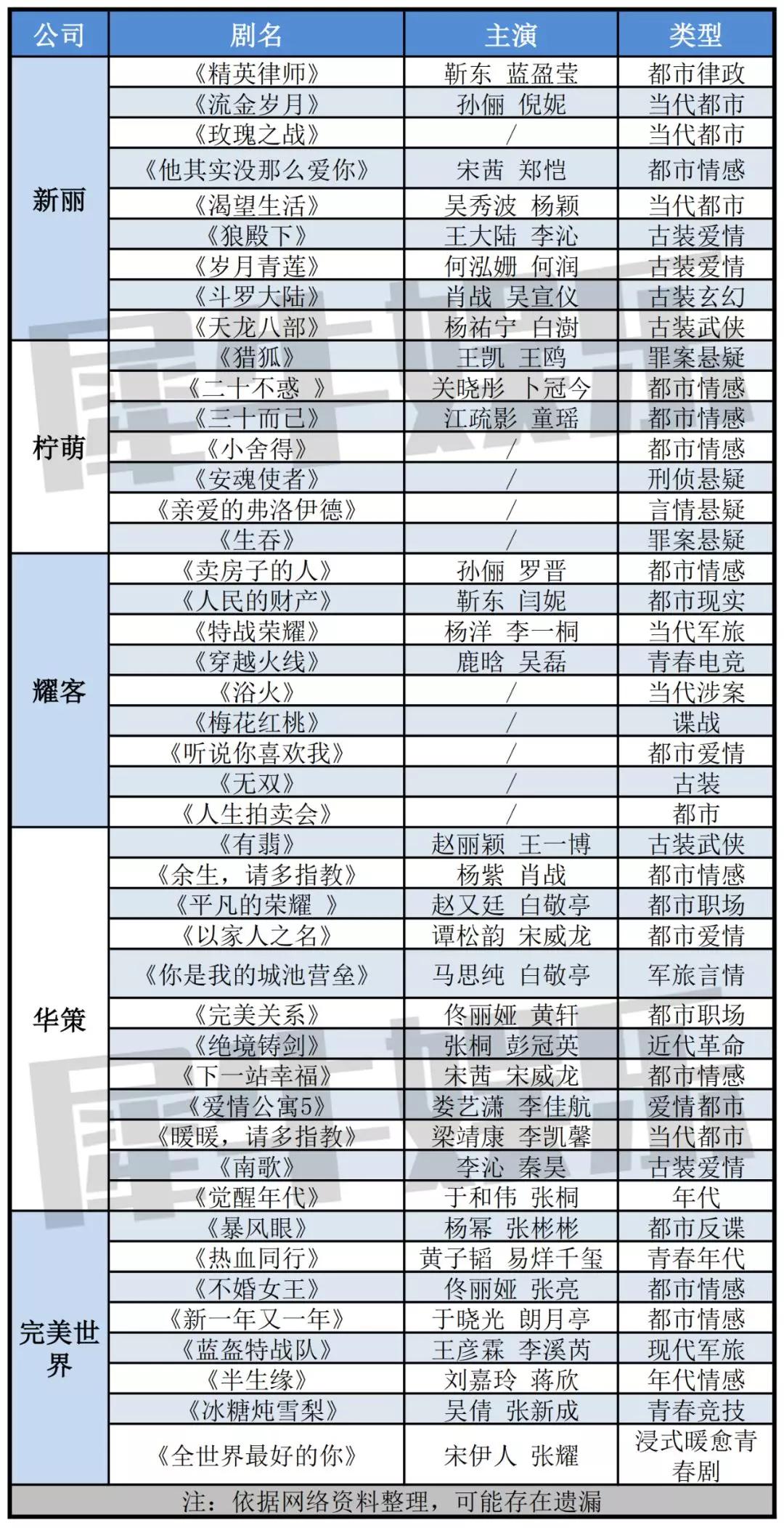 有人正在开拓新方向,有人在深挖自身优势,也有人在稳步提升,犀牛君整理了新丽、柠萌影业、耀客传媒、华策、完美世界五大主流影视公司的2020剧集片单,一起来看看吧。