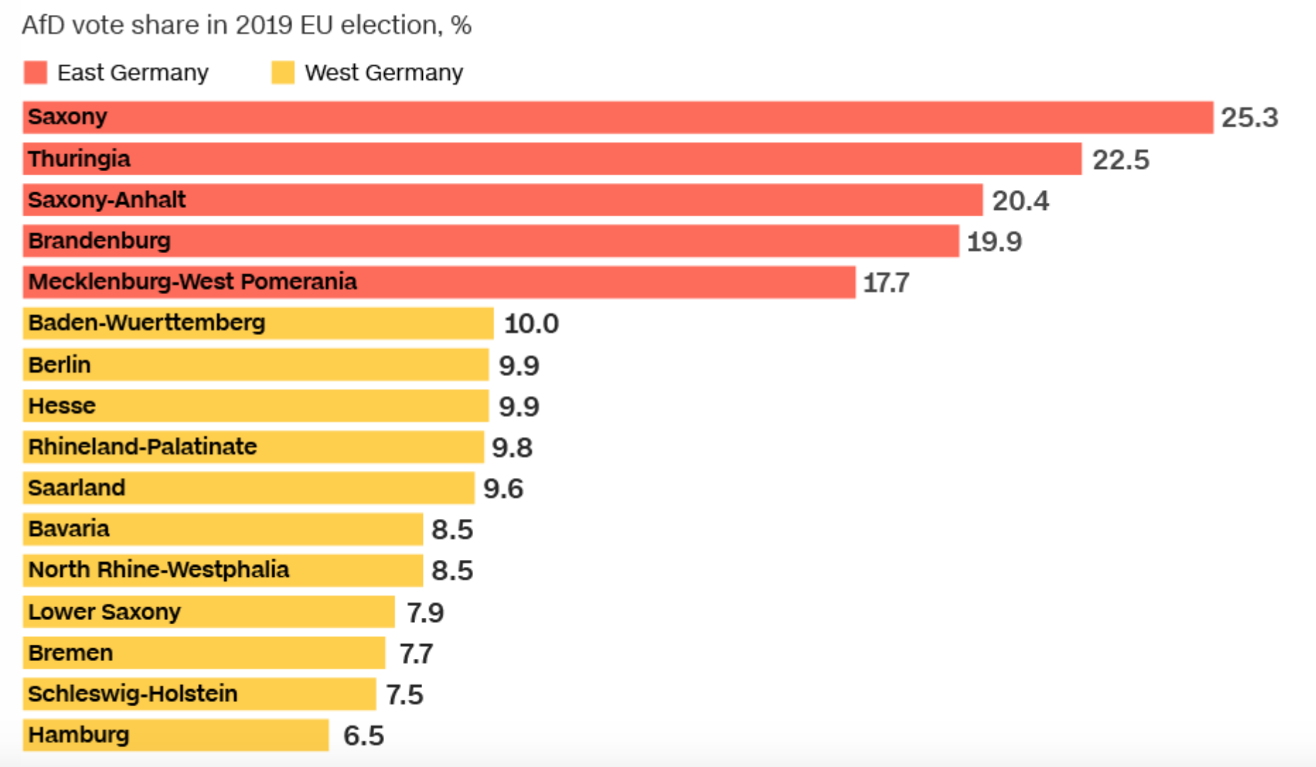 暴力是最极端的表现形式,而沉默的大多数们则在默默通过选票表达声音。在东德五州,“选项党”均有远高于西德地区的支持率。