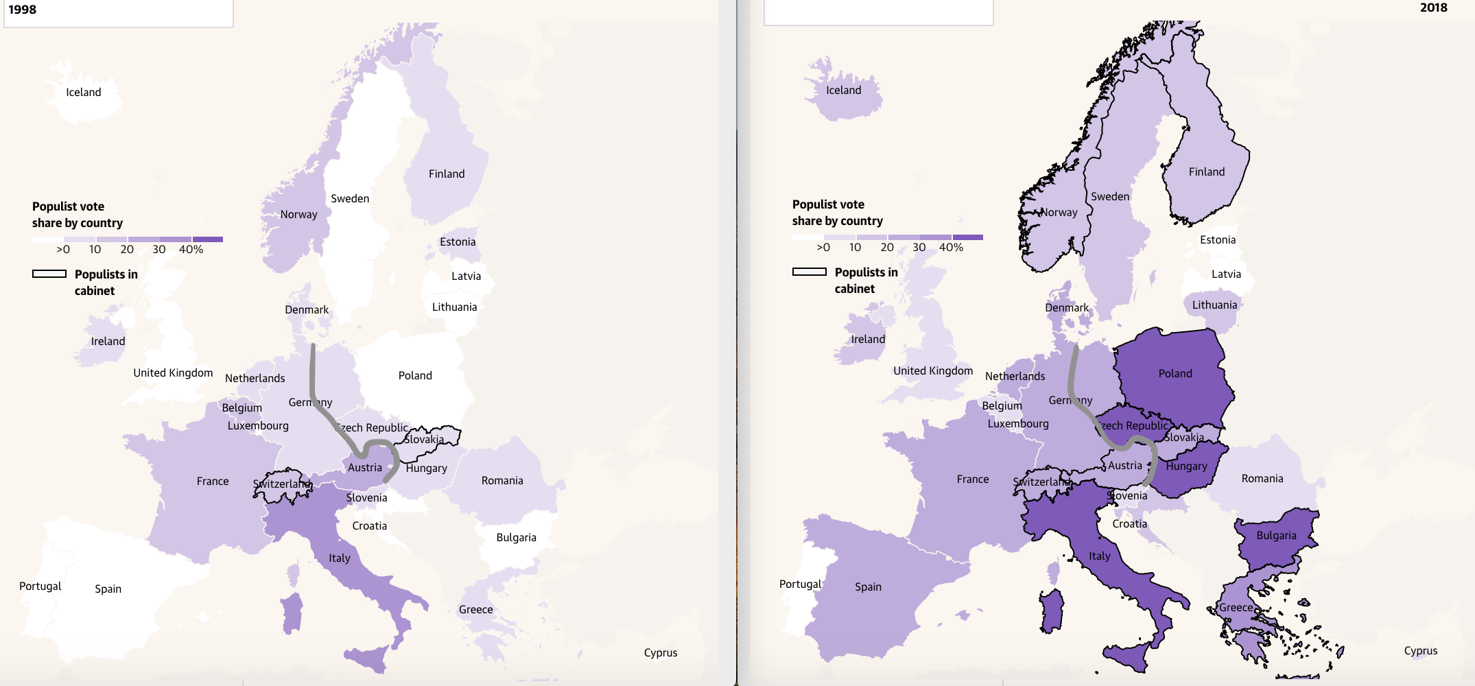 《卫报》的一份研究显示,近二十年来,虽然全欧洲各国也都正在经受不同程度的民粹浪潮,但意大利、希腊以及中东欧的前社会主义国家是增量最明显的地区。在德国,“选项党”于2017年首次进入德国联邦议院并一举成为第三大党;在波兰、匈牙利和捷克,民粹政党都是执政党,占据着舞台的中心。