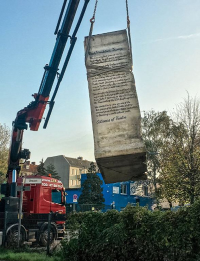 胡斯曼称,柏林墙的残块是从一位柏林商贩手中购得。“开放社会”负责将墙体空运至美国,再用卡车将其送到华盛顿。购买和运输费用全部来自私人捐赠,大概在“五位数”。