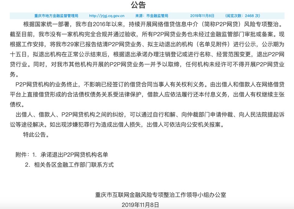 11月8日,重庆市地方金融监督管理局网站发布公告称,根据国家统一部署,该市自2016年以来,持续开展网络借贷信息中介(简称P2P网贷)风险专项整治。截至目前,没有一家机构完全合规并通过验收,所有P2P网贷业务也未经过金融监管部门审批或备案。