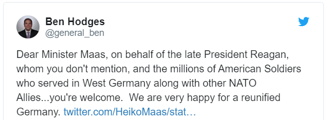 前美国驻欧部队总司令霍奇斯同样在推特上呛声道:“部长先生,我代表您未提及的里根总统和数万名美军士兵,说声不用谢!”