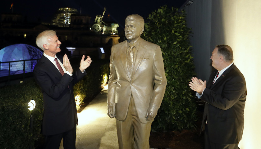 蓬佩奥此行还为柏林带来了一份大礼:一尊3米高的里根总统像。里根于1987年在柏林墙前的著名演讲“戈尔巴乔夫先生,请推倒这堵墙!”是那个时代的标志瞬间。