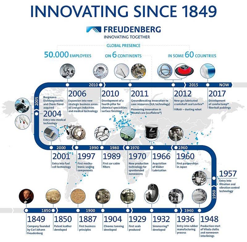 1849年,卡尔·约翰·科德宝(Carl Johann Freudenberg,1819年~1898年)在德国魏茵海姆市创办了自己的皮革厂。从当年一个小皮革加工厂起步,这家拥有170年历史的企业已发展成为一个业务不断壮大的跨国公司。科德宝经历了两次世界大战,三次世界性经济危机。