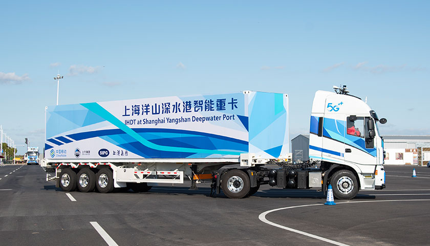 从深水港物流园到洋山码头之间的东海大桥上车来车往,其中一支车身上涂装着“5G+”符号的车队尤为引人注目。