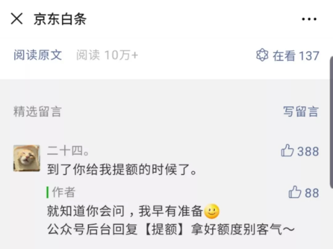 比花呗更早上线的京东白条也一样。在京东白条微信公众号最近一次推送中,点赞最多的一条留言是:到了你给我提额的时候了。白条的回复就像个老朋友:就知道你会问,我早有准备。
