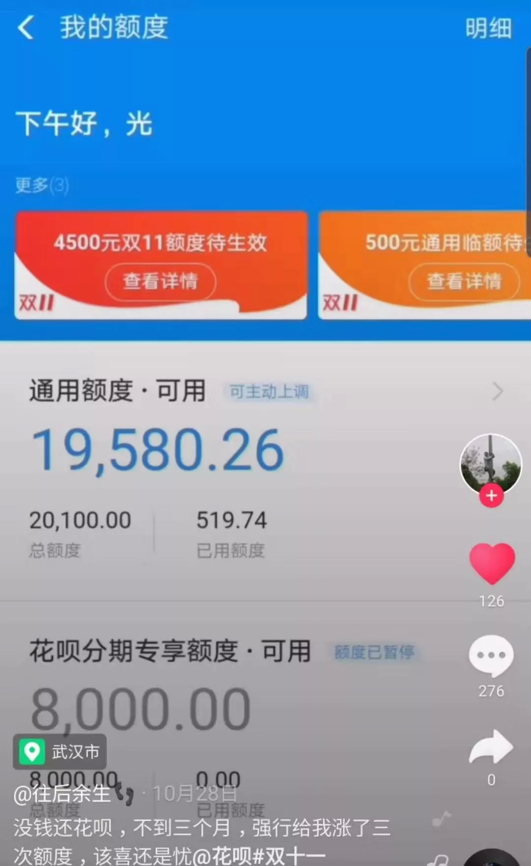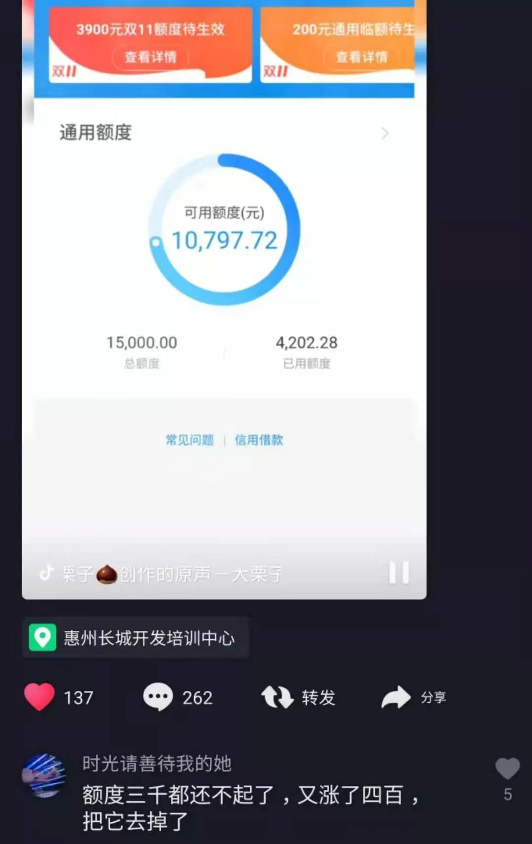抖音上,一位用户分享自己的花呗界面,除了已有的15000元额度外,她还有3900元的双十一额度等待生效。另一位分享自己花呗的用户也差不多,在其总额度20100元只用了500多的情况下,他仍然可以再领4500元的双十一额度。