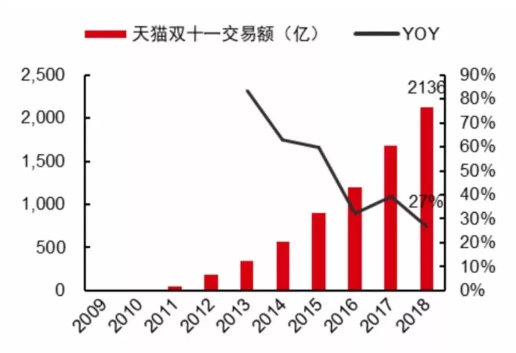 张勇说这话的背后,是阿里双十一自2009年开始后由十多倍的疯涨,变成2018年仅27%的缓慢增长。而这一趋势很可能还会继续持续下去。