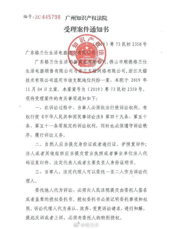 11月5日上午,格兰仕官方微博发布声明称,已于10月28日向广州知识产权法院就天猫涉嫌滥用市场支配地位等相关事宜提起诉讼,并于11月4日获得立案。