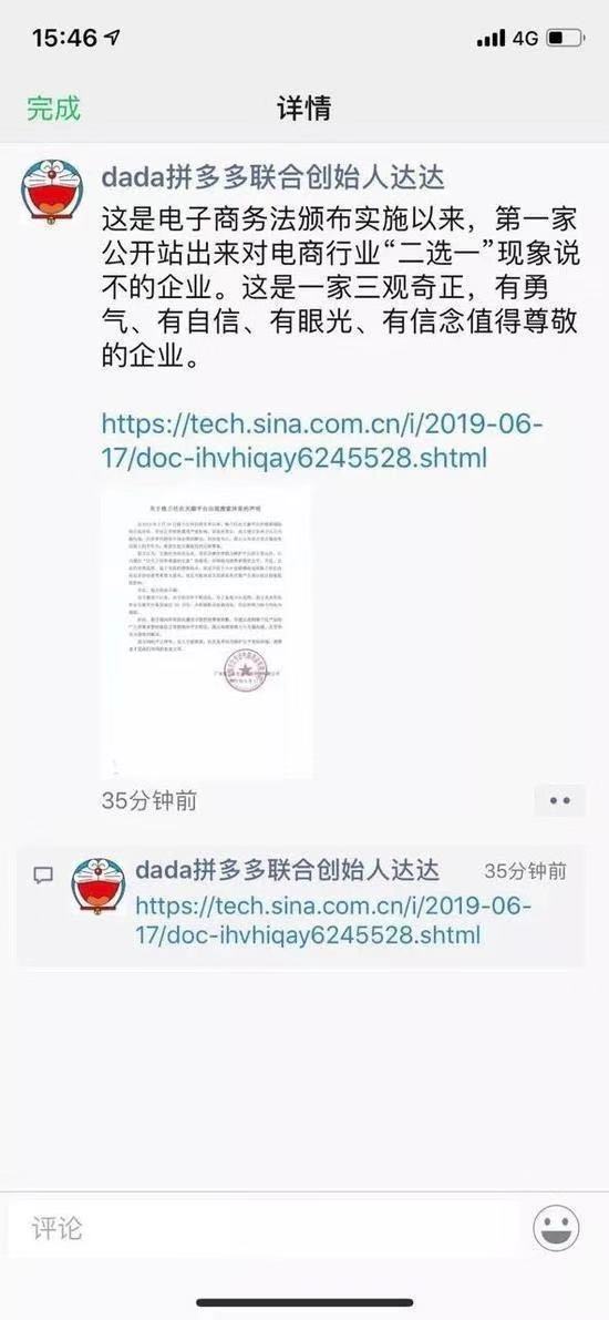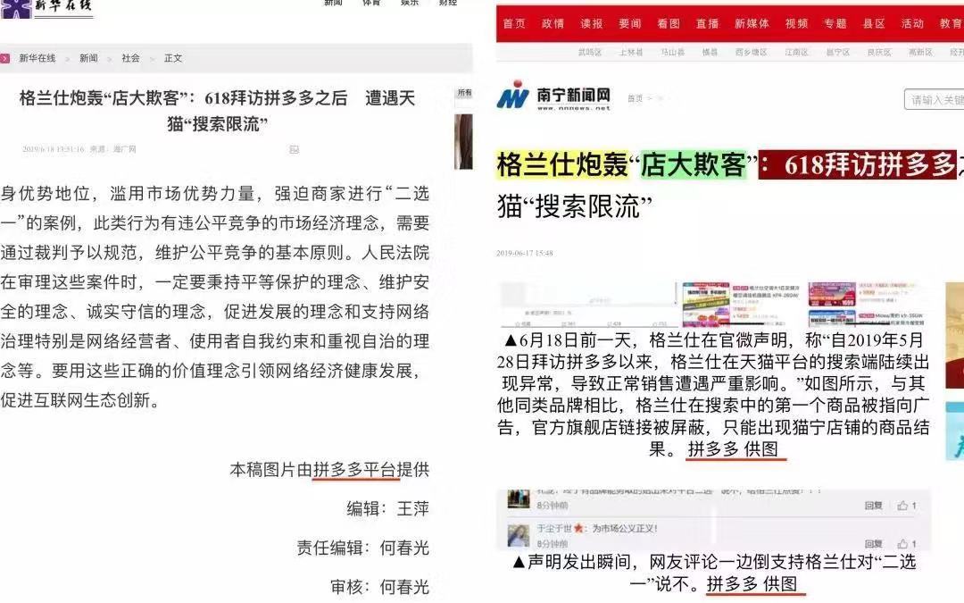 记者发现,在京东与拼多多的申请书中,均提及格兰仕之前声明“遭天猫二选一”,以佐证己方观点。
