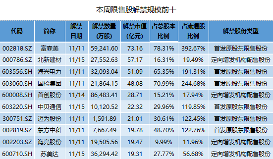 解禁市值超过10亿元的上市公司合计有14家,以富森美为首,解禁市值达73.16亿元,北新建材(000786.SZ)、海兴电力(603556.SH)解禁市值超过50亿元。