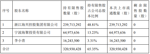 同日,海兴电力也将迎来其首发限售股解禁,公司股价同样处于破发状态。公告显示,本次解禁涉及股本数量达3.21亿股,占公司总股本的比例也在65.35%,涉及解禁市值达51.09亿元。此次解禁涉及股东包括公司控股股东浙江海兴控股集团有限公司、杭州海聚投资有限公司和自然人李小青。