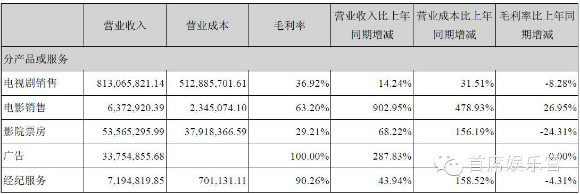 从净利润来看,华谊归属于公司普通股东的净利润为为5亿元,较上年同期相比增长35.41%;华策影视归属上市公司股东净利润2.18亿元,比上年同期增长7.55%;而光线传媒归属于母公司所有者的净利润仅为8,218万元,比上年同期降低19.78%。