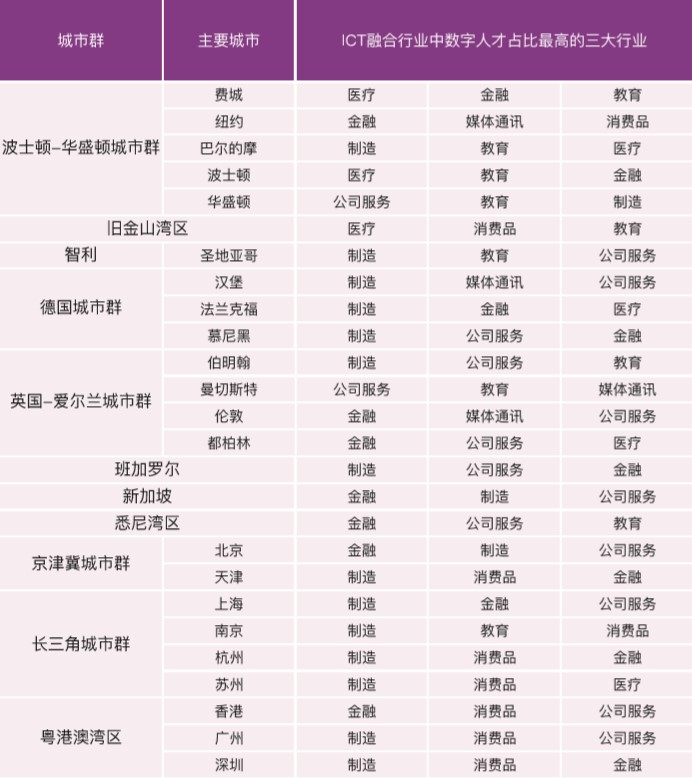 一项基于全球数字创新城市群的研究显示,数字人才吸引力最高的五个城市分别是都柏林、圣地亚哥(智利)、上海、深圳和班加罗尔(印度)。与之相反的是,有七个城市数字人才流出大于流入,分别是北京、费城、广州、巴尔的摩、伯明翰、南京和天津。
