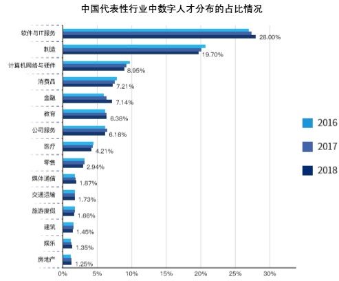 从行业角度分析,数字人才在ICT(信息和通讯技术)融合行业的占比要超过ICT基础行业。报告指出,这个结果表明,数字化转型正在从ICT基础行业向传统行业延伸,包括制造、医疗、金融、公司服务、消费品、教育和媒体通信等行业。