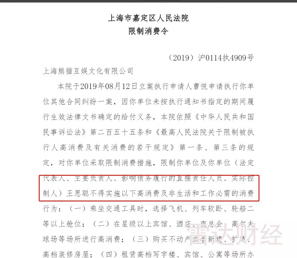 限制消费令指出,因熊猫互娱未按执行通知书指定的期间履行生效法律文书确定的给付义务,被采取限制消费措施,限制其法定代表人、主要负责人、影响债务履行的直接责任人员、实际控制人王思聪不得实施高消费及非生活和工作必需的消费行为。该限制消费令的颁布日期为2019年10月12日。