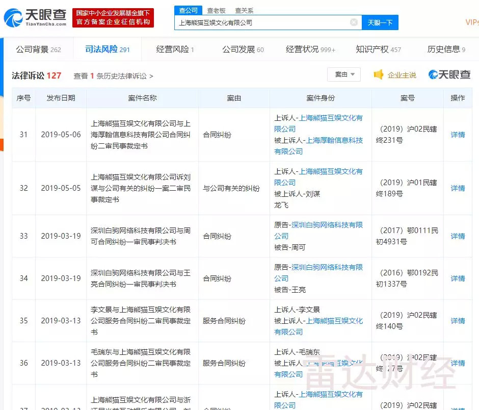 雷达财经查询发现,除了被旗下主播起诉,熊猫互娱还涉及多种类型纠纷。截至目前,公司共涉及127起诉讼。