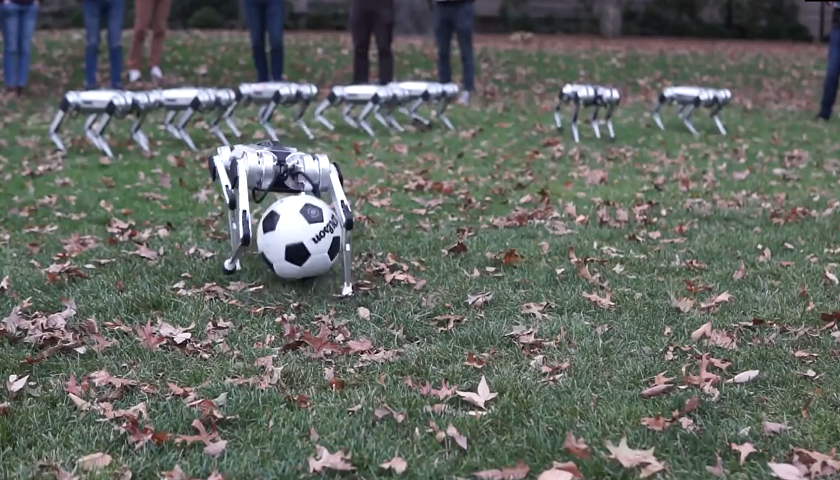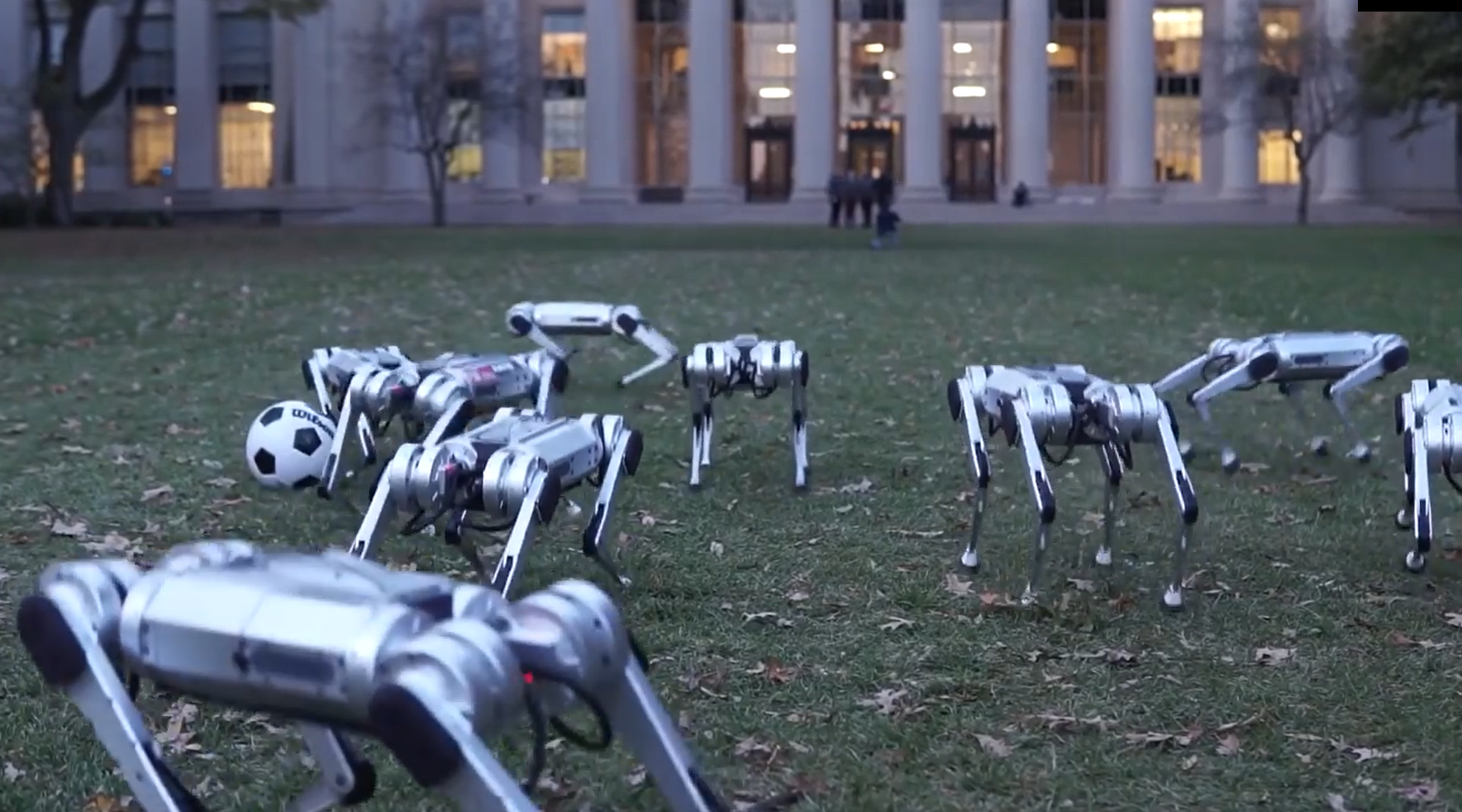 如今,麻省理工学院的九台迷你猎豹机器人(Mini Cheetah)也学会了这个动作,还在一起踢起了足球。