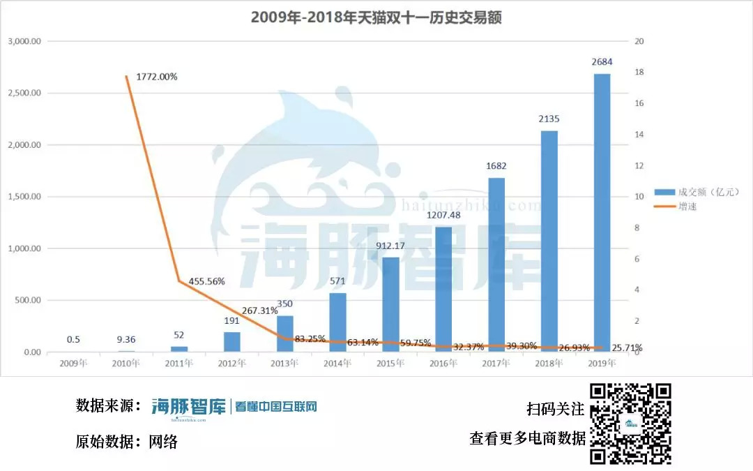天猫双十一最终成交额刚刚出炉,截至北京时间24时,2019年天猫双十一总成交额达到2684亿。