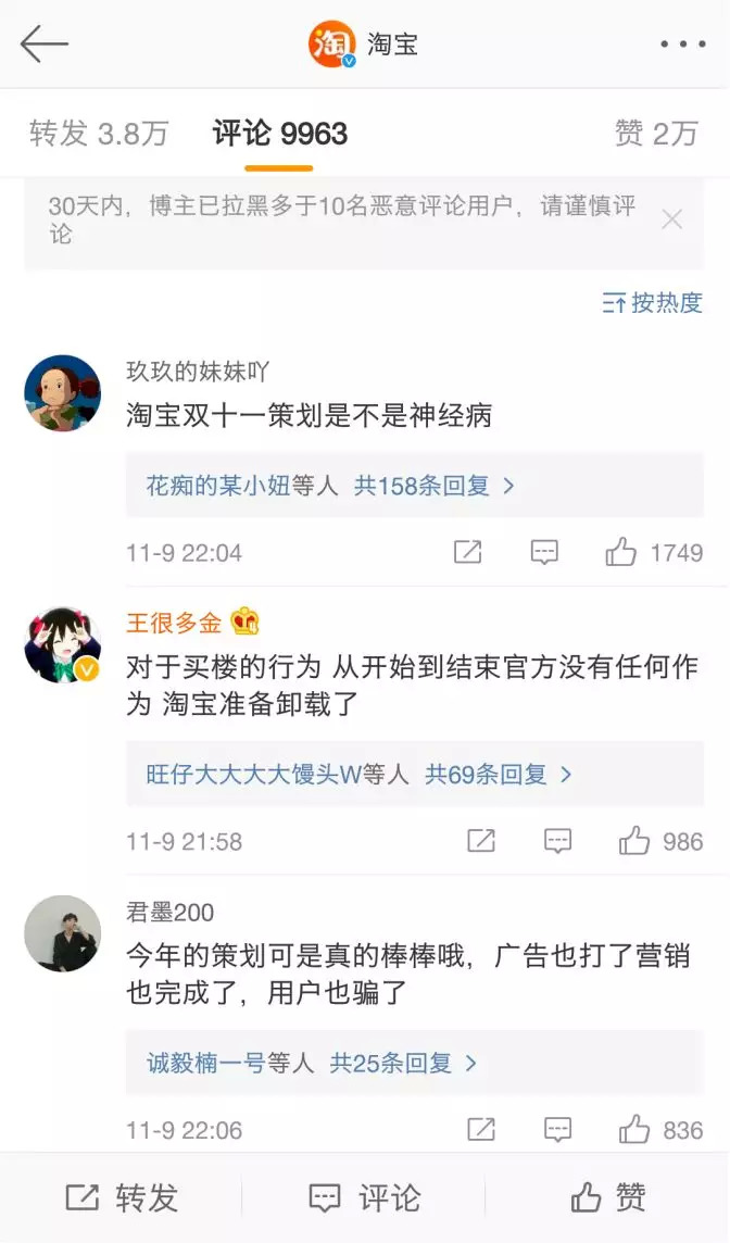 当用户花了大量精力给平台拉人,却获得几块钱红包时,一种我把你当朋友你却把我当私域流量的悲伤感油然而生。也难怪在活动结束后,大量的用户跑到淘宝微博下愤愤不平地留言。