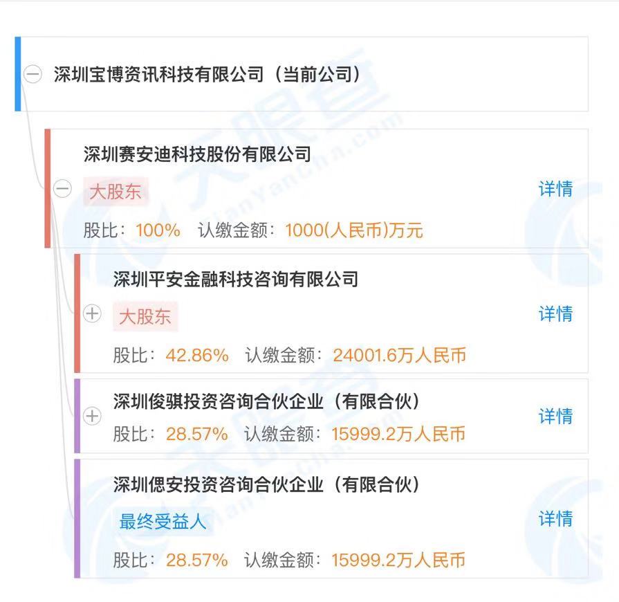 蓝鲸财经记者发现,招聘信息中的“宝博资讯”系深圳赛安迪科技股份有限公司全资子公司,深圳平安金融科技咨询有限公司持有其42.86%股份。