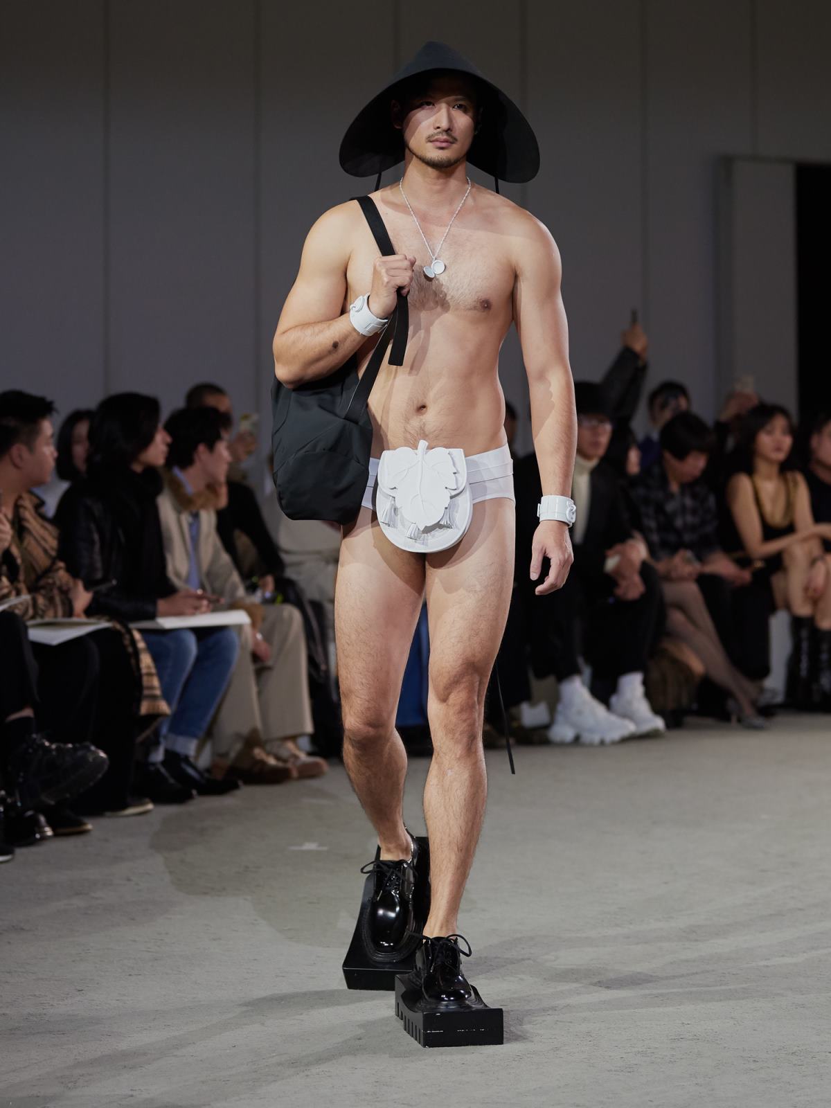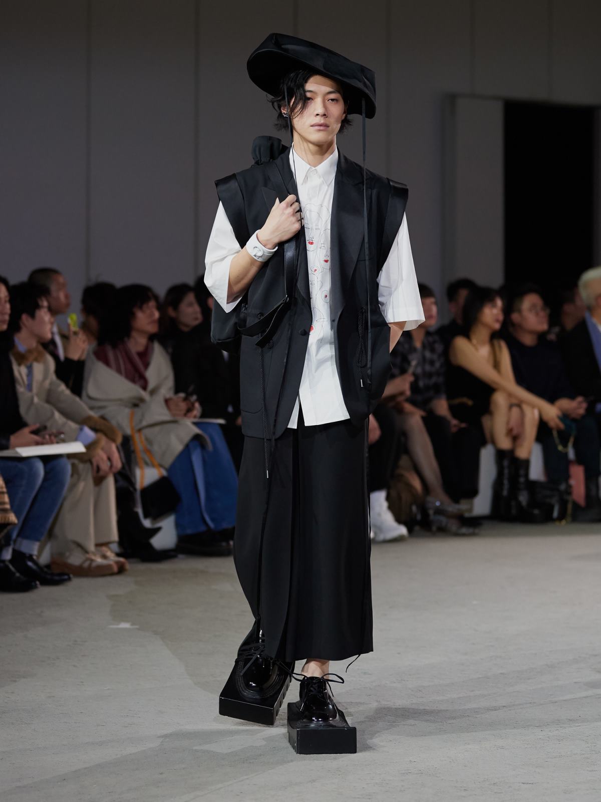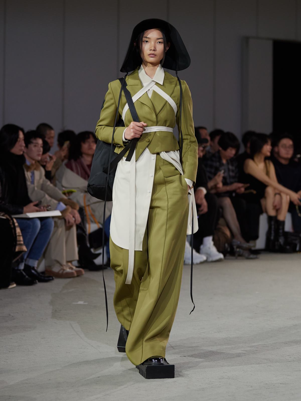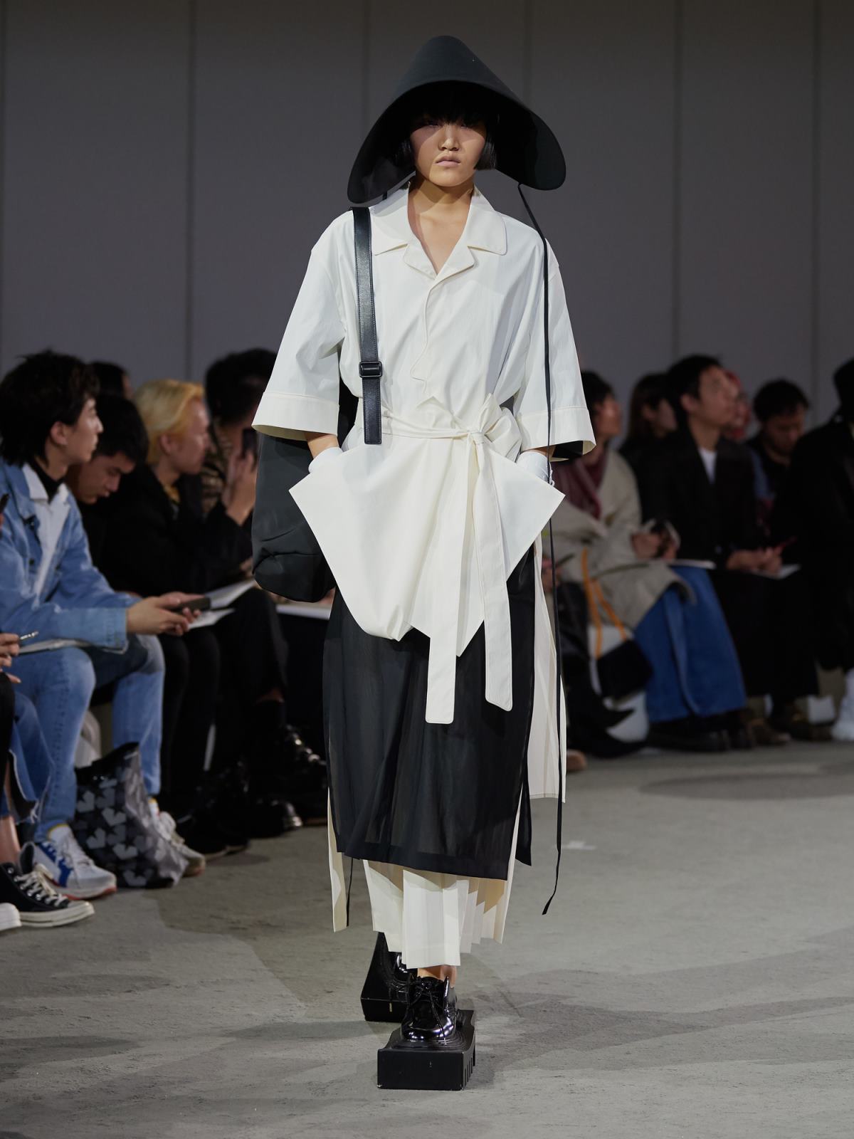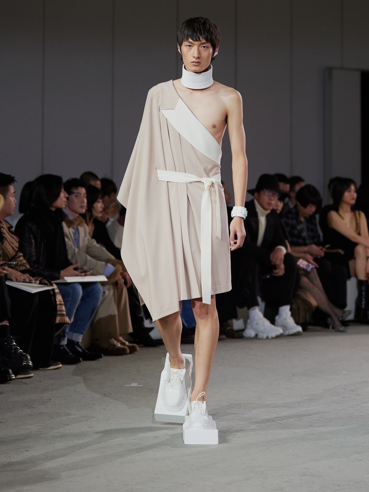 借用契诃夫著名短篇《装在套子里的人》为引子,两位设计师试图通过这个“半成品”装置来展现一个希望升起又幻灭的乌托邦场景,一如文章中别里科夫融合乌托邦体制顺从者与社会压抑形态下受害者的矛盾形象。而在服饰上,MAISON SANS TITRE首先表现出的是“破坏”。穿着硕大捆绑和修行概念夸张鞋履的模特在秀场上缓慢地行走,大量不对称设计和褶皱束缚细节搭配西装式剪裁半领外套和半边连衣,在一放一合间营造出对旧体制的破坏与缝补。
