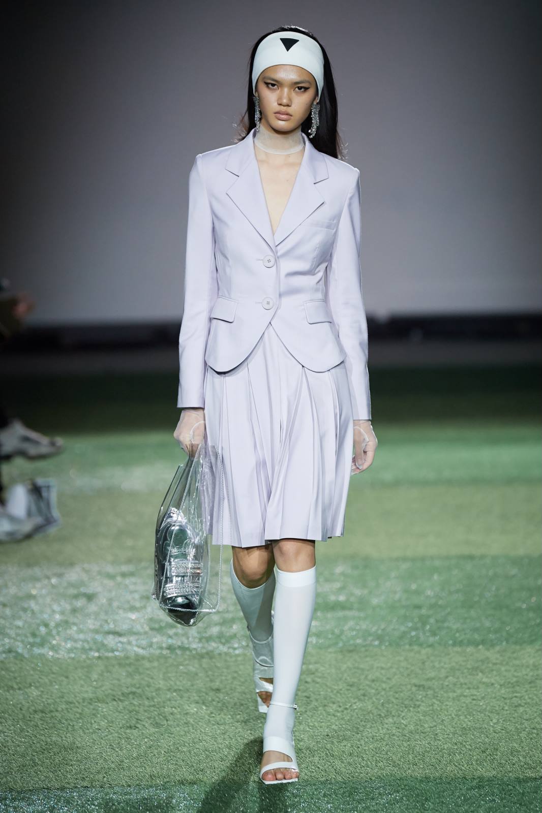 网球场上的运动发箍是系列中出现频率最高的单品,它本身自带的运动风格与模特身上穿着的服饰形成了对比;而当Leggings在大秀的后半程也伴随出现时,人们很快便会意识到这是一种对突破女性传统身份桎梏的暗喻,身着柔美丝绸裙装的办公室职员也许下一秒就能在球场上挥汗如雨。
