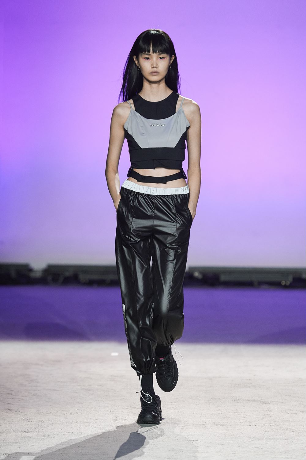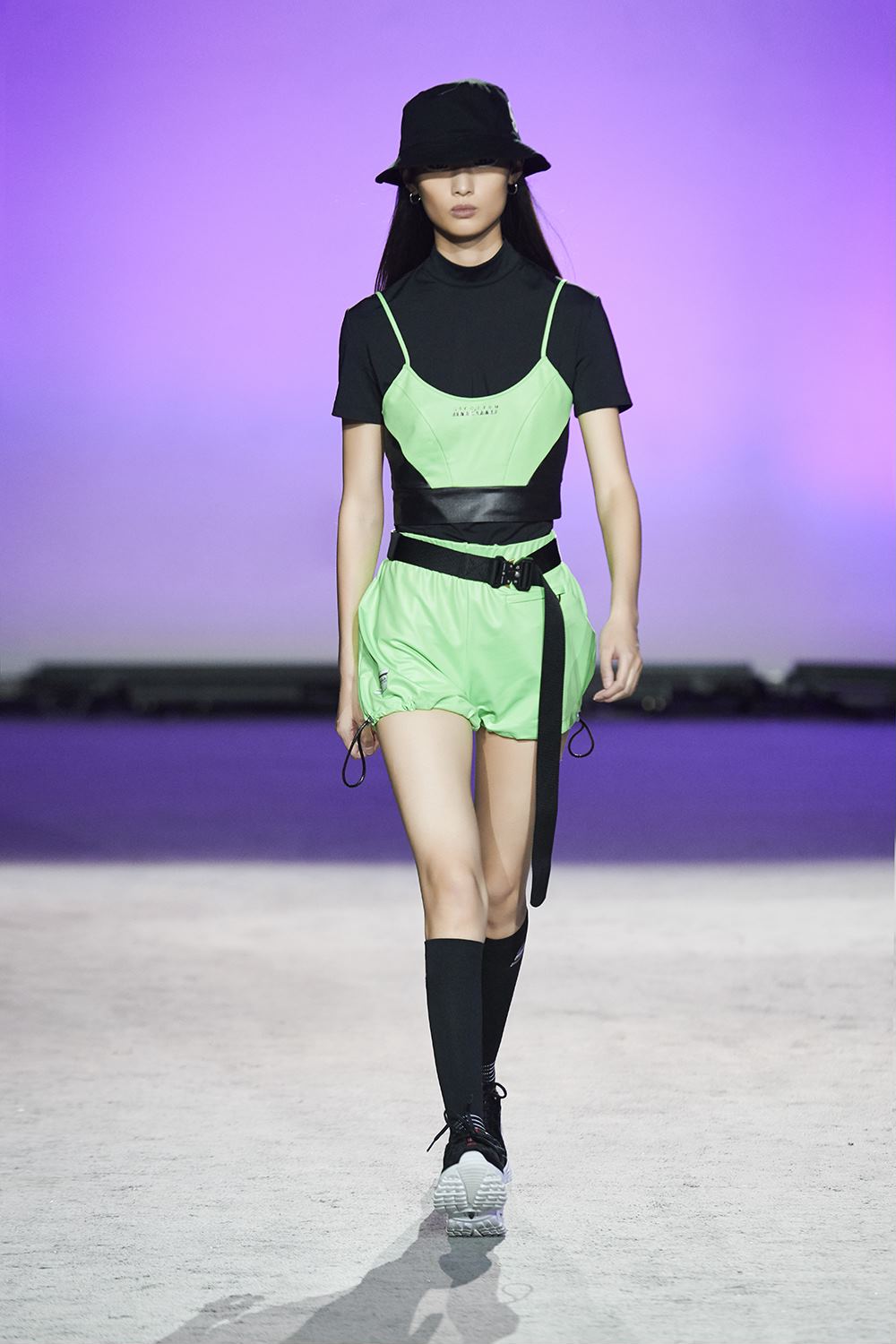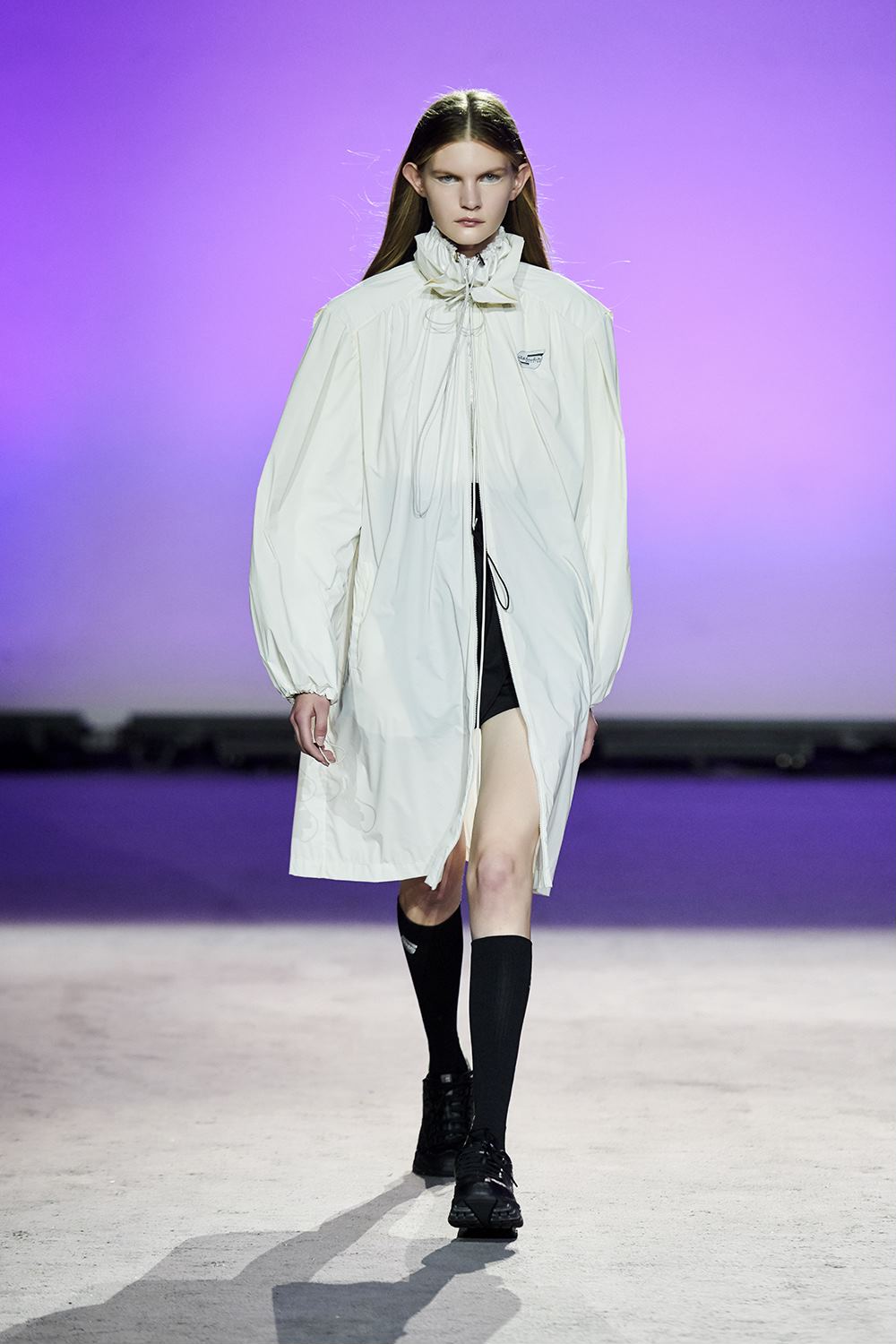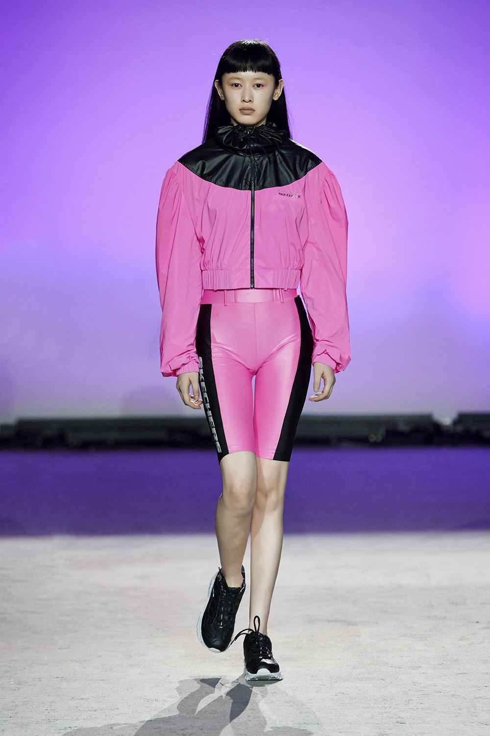1992是SKECHERS诞生的年份,上世纪90年代的经典运动也因此在延展台上成为主角。宽松的冲锋衣、紧身单车短裤以及“内长外短”的T恤搭配都展现出了设计师对往日时光的怀念。亮丽的桃红色、湖蓝色与柠檬绿则是让秀场从怀旧的沉重感中脱离,带来活跃的气息。