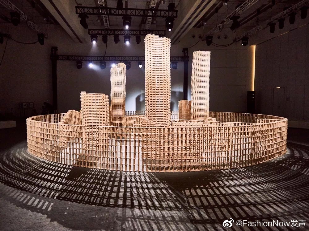 MAISON SANS TITRE在秀场上搭了一座巨大的多米诺骨牌矩阵,层层堆叠起来的积木形成了多座高矮不一的圆塔,粗粝的外观表明它们正处于未完成状态。圆塔外边则围起了城墙,朴素的外观让人联想到凌乱的工地。通过这个巨大的艺术装置,MAISON SANS TITRE十分直接地点明2020春夏系列的主题:套中人。