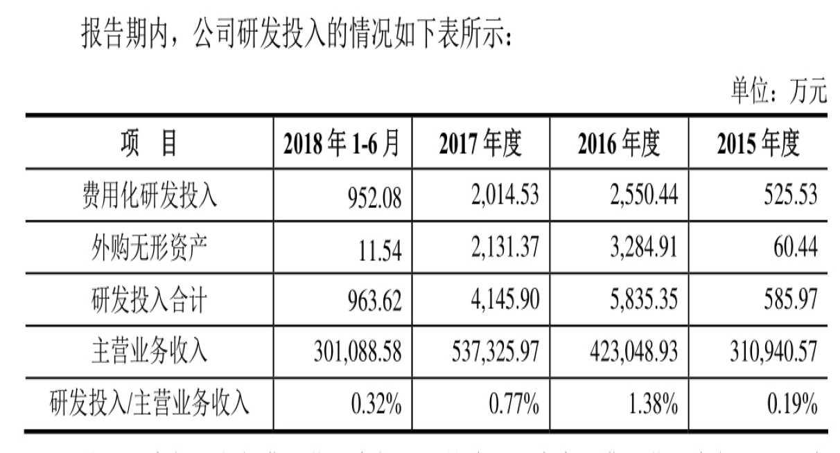 而同一时期,公司在研发方面的投入分别是585万元、5835万元、4145万元和963万元,分别占同期营收的0.19%、1.38%、0.77%、0.32%。