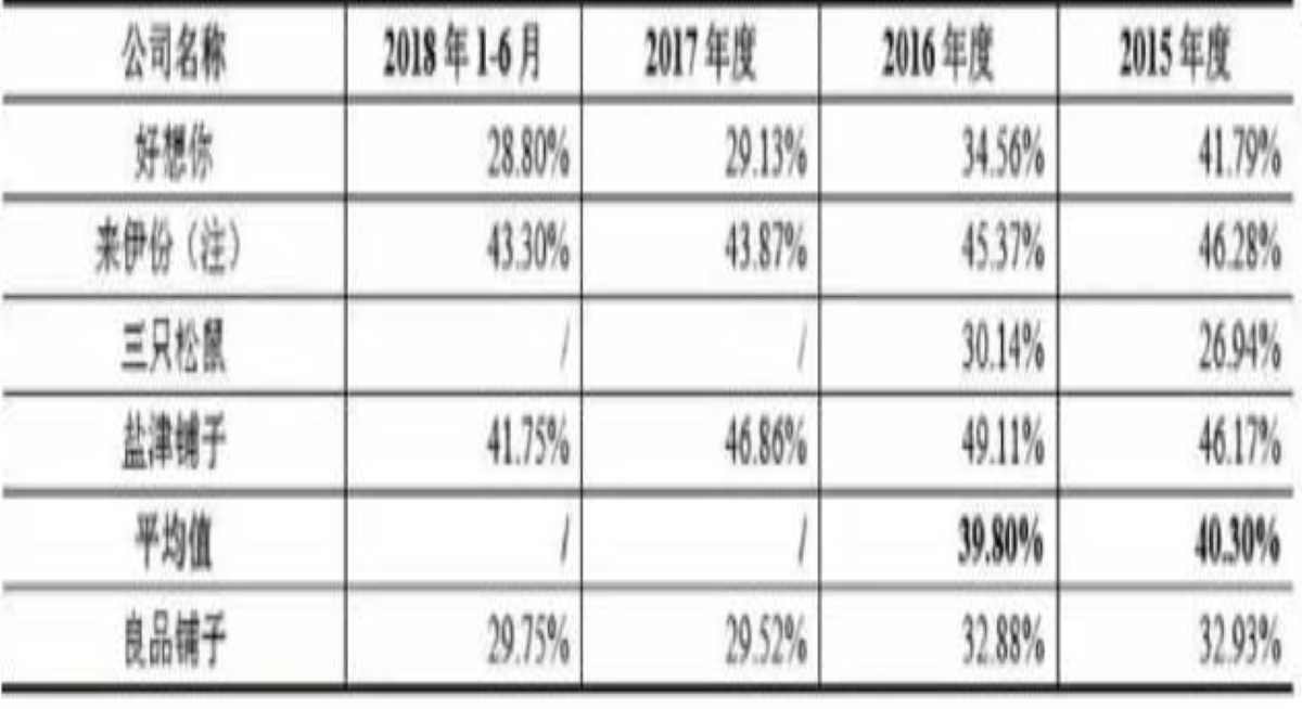 这源于良品铺子的毛利率低于行业平均值,且呈现下滑趋势。2015年,良品铺子毛利率为32.93%,行业均值为40.3%;2016年为32.88%,行业均值为39.8%;2017年与2018年上半年毛利率分别为29.52%、29.75%,而同行来伊份与三只松鼠均在40%以上。