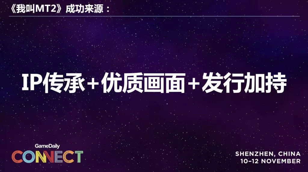 第一次跟腾讯合作,感受了非常大的压力。封闭开发将近5个多月,100多人的团队只放了2天假,一天给大家放假去团建,还有一天是元旦,所以所有的成功背后都有巨大的付出。最后MT2也取得非常不错的成绩。