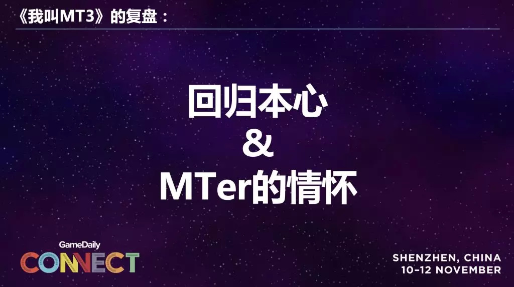 所以不管创业团队也好,像我们这种研发体系的公司也好,方向是很重要的。那么我们有了这个结论以后,作为方法论来说,未来MT5、MT6,一定会深耕MMORPG来做,也会围绕着我们用户的情怀,回归本心来做这个产品。