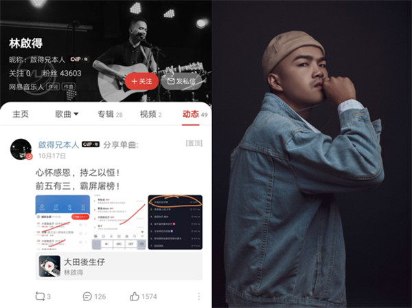 “这可是网易的老板丁磊啊,第一首歌就火了,评论快速增加到八九千,那个时候一首歌的评论能达到‘999+’就算是很火了。”林啟得说,在网易云音乐上粉丝从零开始陆续增长到4000多,“然后就不停地有粉丝私信给我,叫我快点发新歌,这对我其实鼓励很大。”