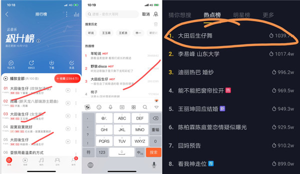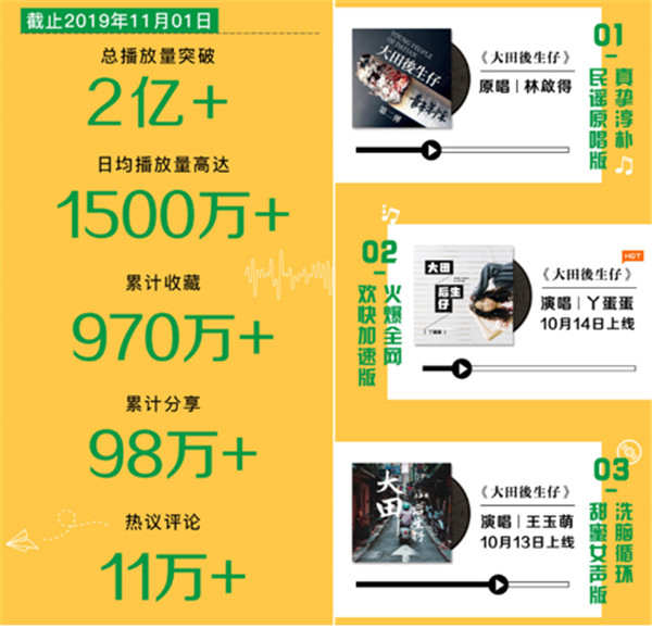 3个月后,网易云音乐发布的数据证明了一切:《大田后生仔》总播放量突破2亿+,日均播放量高达1500万+,累计收藏近1000万+,累计分享98万+,热议评论快速突破10万+。除了林啟得原唱的“真挚淳朴民谣原唱版”,另外还有两个“欢快加速版”和“女声版”,3首歌在同一天登上网易云音乐飙升榜前5位。