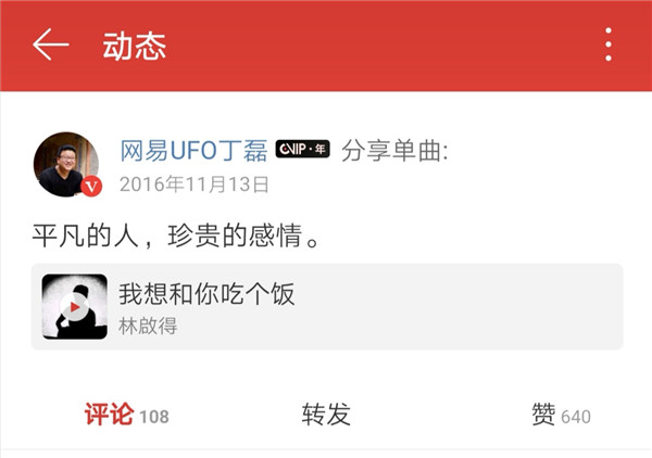 就在歌曲发布后的第9天,一位名叫“网易UFO丁磊”的云村村民在网易云音乐转发了《我想和你吃个饭》,并写了一句评语:“平凡的人,珍贵的感情。”