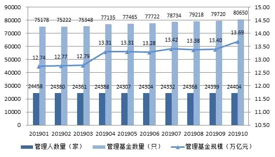 今年前10月,私募基金数量从2018年底的74642只增至80650只,共增加了6008只;管理基金规模也从12.70万亿元增至13.69万亿元,增加近1万亿元。
