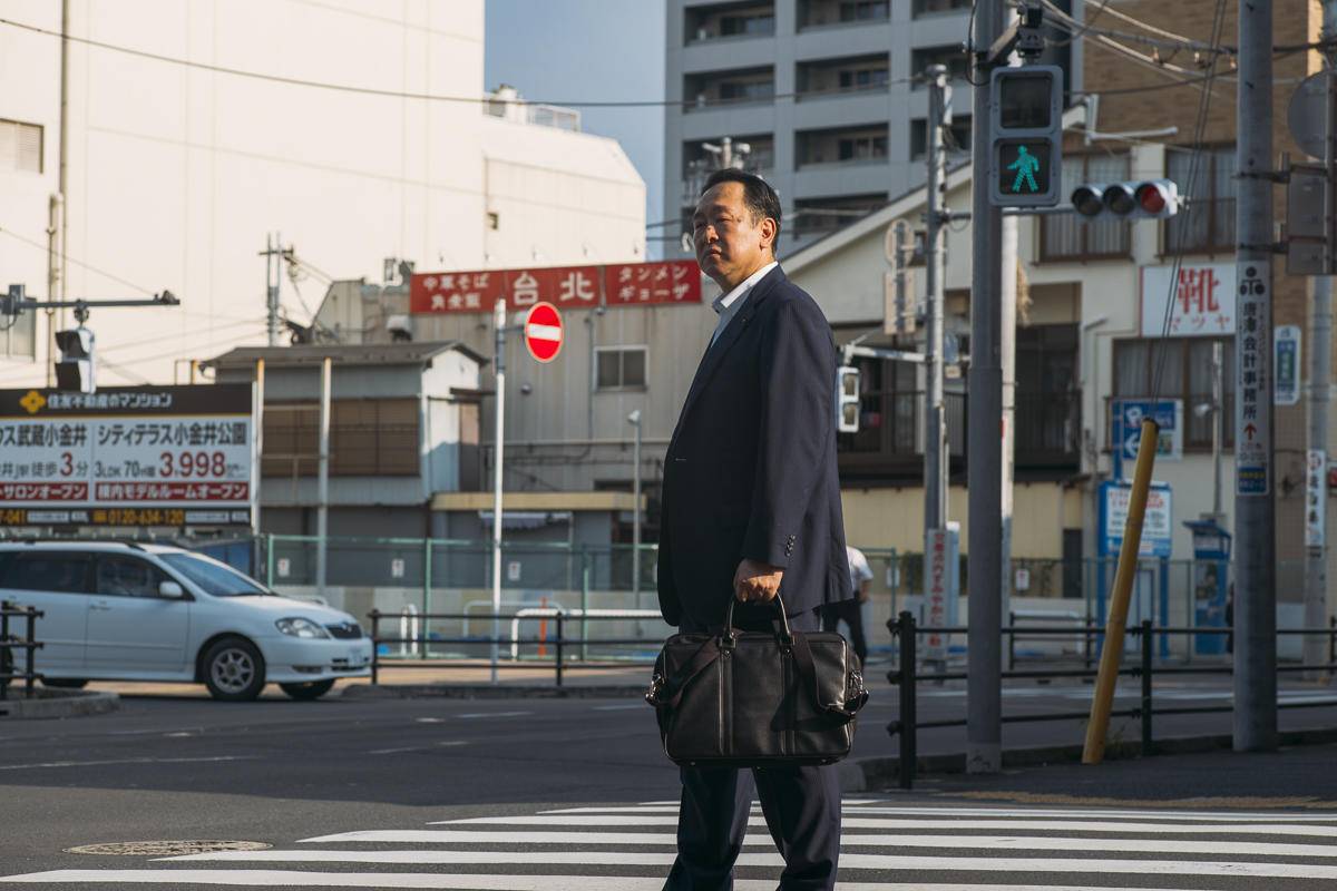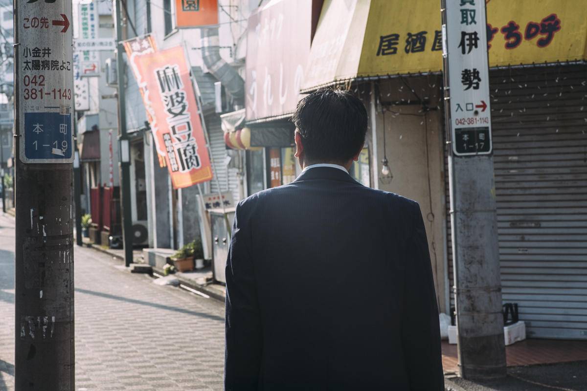 他梳理仪容,穿戴齐整的衬衫和西装,领着公文皮包离开家,穿过小巷,清晨的阳光斜洒在脸上。他走在空荡的街道上,很安静,店铺尚未开张。