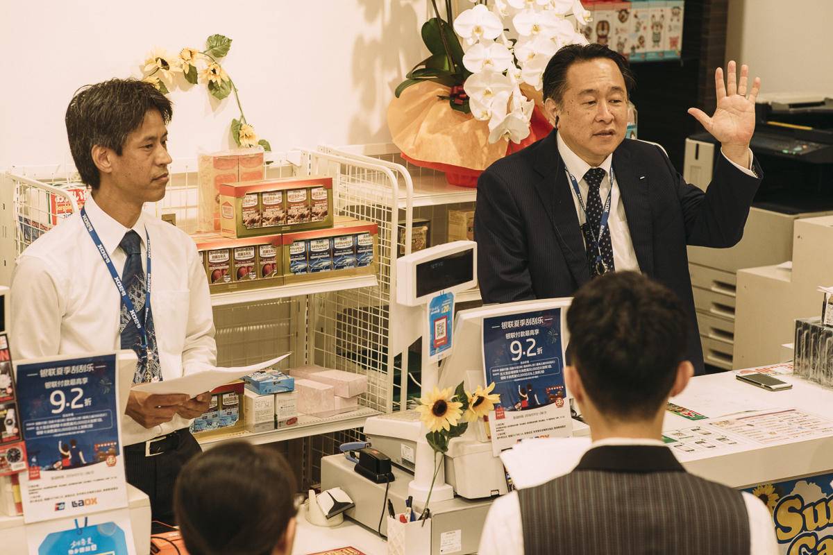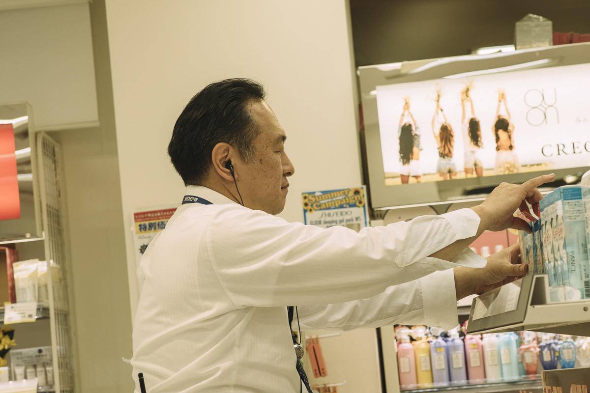 早上9点,店铺开始营业。旅游大巴停在店铺门口,一车一车的游客涌进了货架归置齐整、明亮整洁的免税店,店里喧闹起来。佐藤来到店门口,笑容亲和,恭敬地向顾客们鞠躬问候。他走出店门查看店外环境,客客气气地引导不经意间拥堵在人行道上的客人让出路人通行的空间。接着他又返回店里,穿梭在货架和顾客之间,一层楼一层楼地走动查看,随手归位遮挡通道的大件商品,麻利地将货架上被挪动过的化妆品摆放整齐。他的腰带上别着对讲机,随时根据现场状况与楼层经理进行沟通。