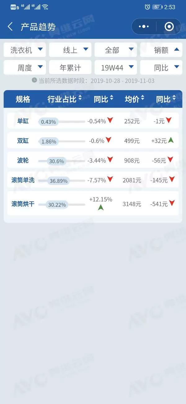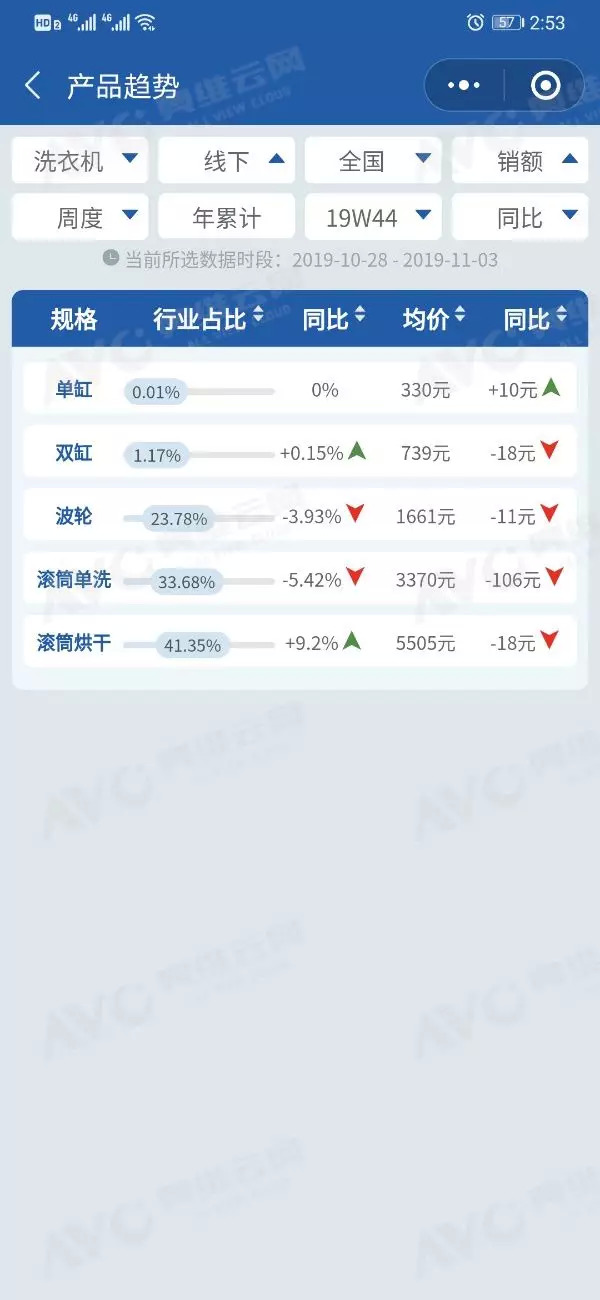2019年第44周洗衣机细分品类销售情况