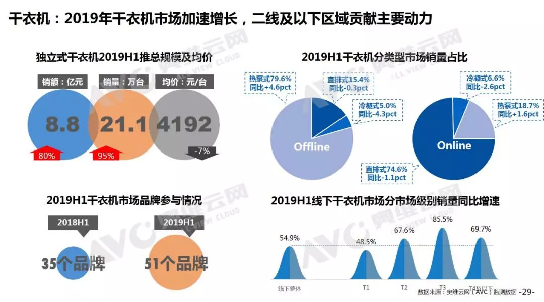奥维云网(AVC)的监测数据显示,2019年上半年独立式干衣机零售额为8.8亿元,同比增长高达80%;零售量更是达到21.1万台,同比增长95%。洗烘一体机零售额同比增长18.9%,销量同比增长8.2%。