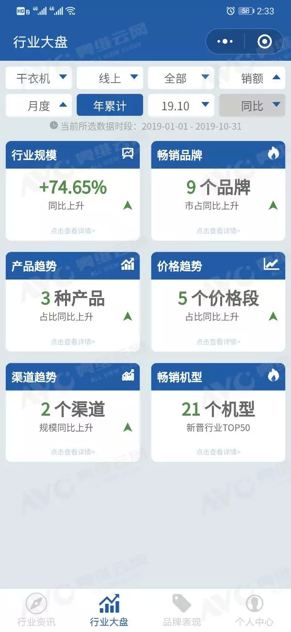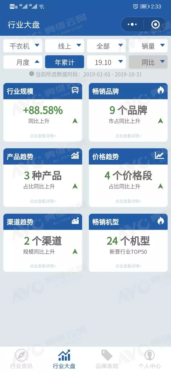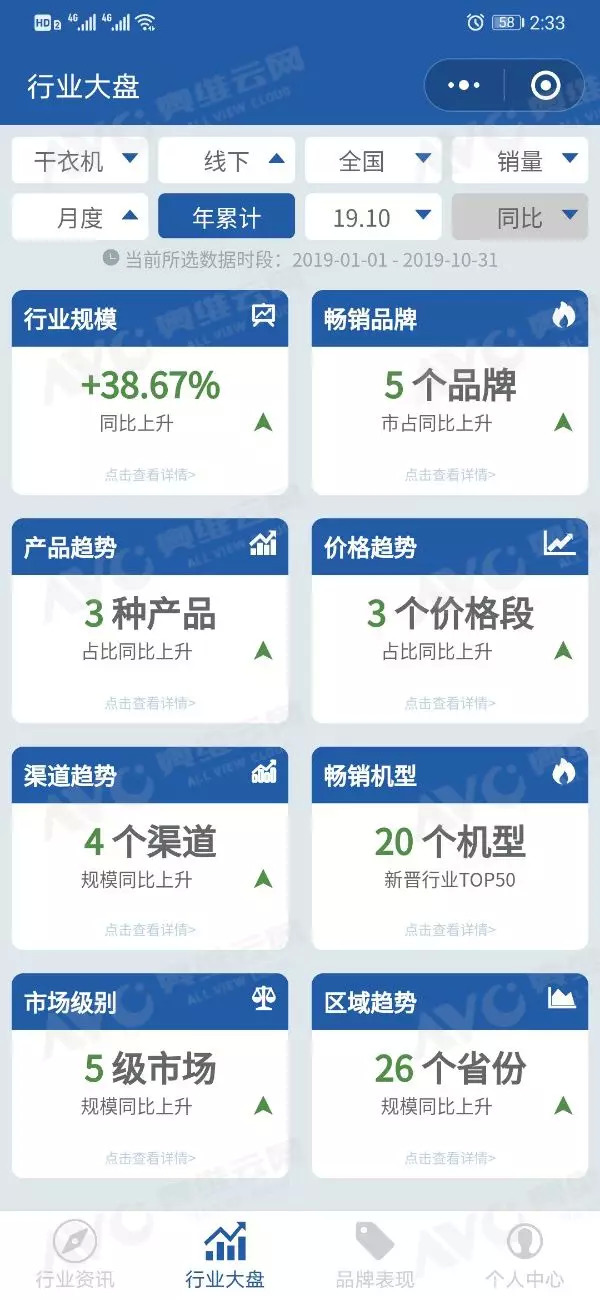 奥维掌上罗盘小程序的监测数据显示,2019年1-10月,干衣机线上渠道销售额同比增长74.65%,销售量同比增长88.58%;线下市场销售额同比增长48.12%,销售量同比增长38.67%。干衣机产品在整体白电市场增速方面一骑绝尘,持续领跑。