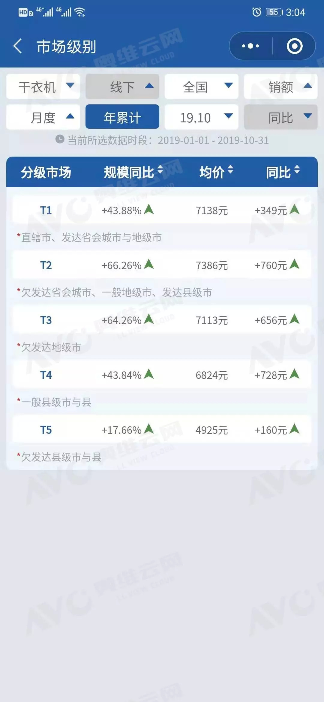 2019年1-10月干衣机各级市场及不同区域销售趋势